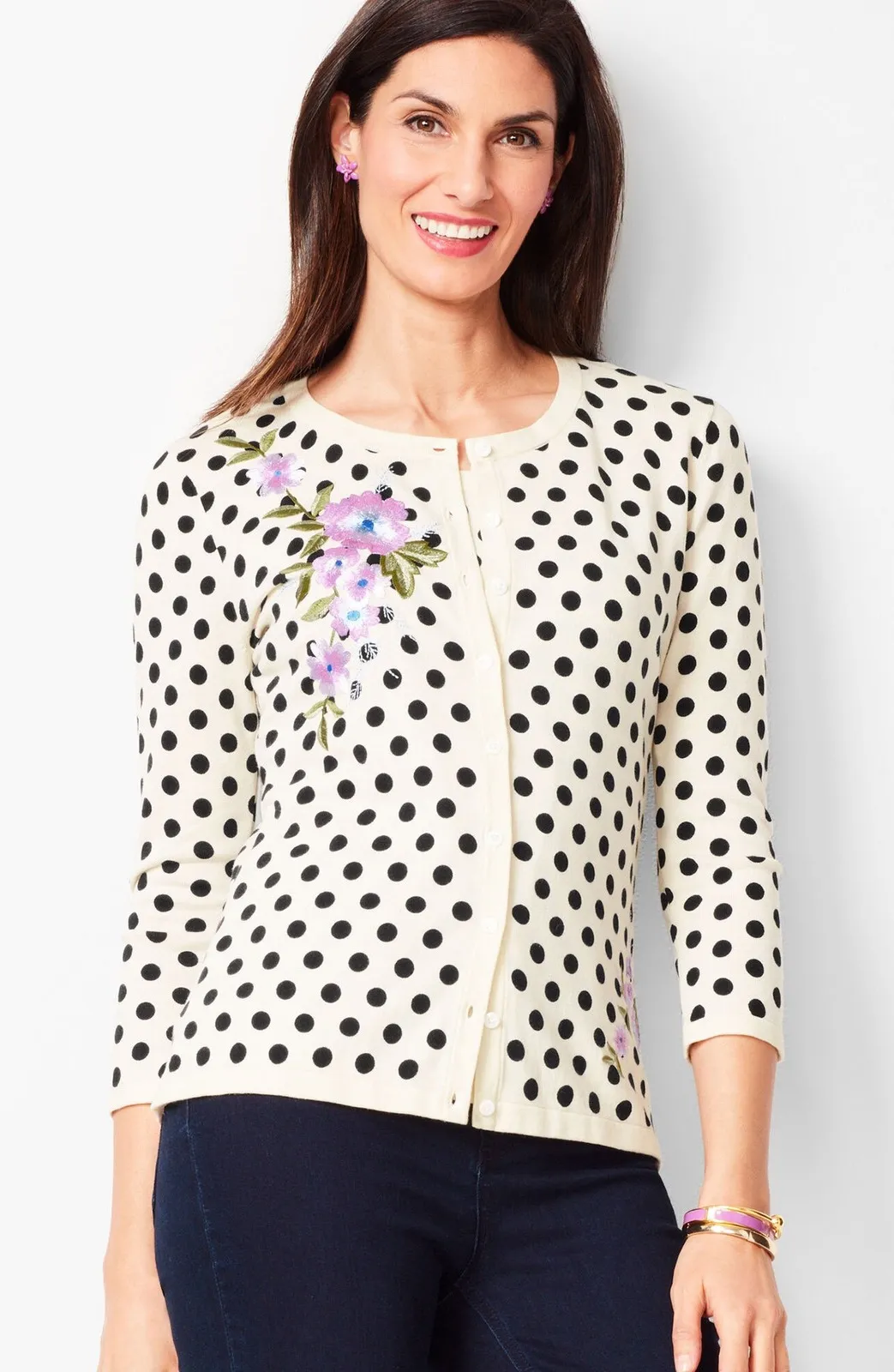 Charming polka dot cardigan sweater by rsvp by Talbots, a delightful addition to any wardrobe. This knit top features a classic polka dot pattern in black against a cream backdrop, offering a timeless and versatile look. The front is adorned with delicate floral embroidery in shades of purple and green, adding a touch of femininity and elegance. The cardigan has a comfortable, flattering fit with a button-down closure and 3/4 sleeves. Perfect for a casual brunch, a day at the office, or a cozy evening out.
