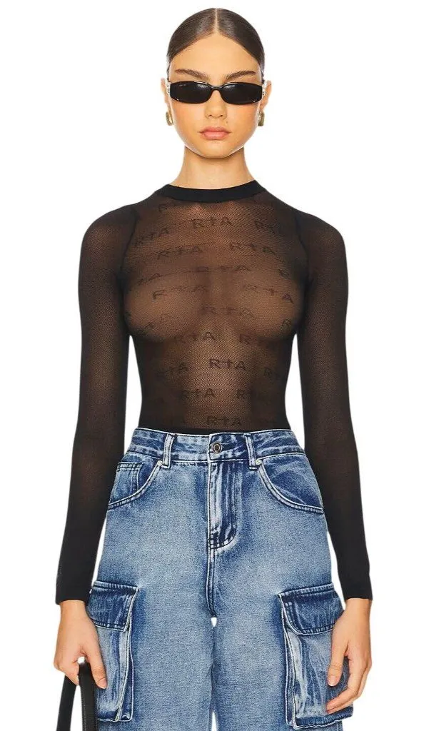 The Dahlia Top in Black RTA All Over is a jacquard sheer, mesh long sleeve top featuring an allover logo repeat design. 95% nylon, 5% spandex Hand wash Pull-on styling Lightweight mesh fabric Garment is intentionally sheer, undergarments will show through. Please note undergarment not included Revolve Style No. RTAR-WS198 Manufacturer Style No. WF24W725-T2026BLKAO Color: Black MSRP: $95 Features: • Totally Sold out on Revolve! Size: Womens M-L Condition: New With Defects teeny tiny repair at upper front shoulder Tags: knit, punk, beach, transitional, boho, layer, base, cropped, fall, winter, distressed, goth, loungewear, undershirt, sexy, camisole, tank top, crop top, sheer, see through