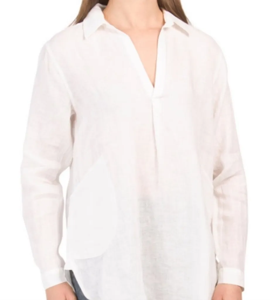 MAGASCHONI Linen Lagenlook Oversized Tunic Excellent Pre-Owned Condition Size M Color: White & Light Natural Tan Stripe DESIGNED IN NEW YORK CITY WITH CAREFULLY SPUN LUXE BELGIUM LINEN CURATED FOR YOUR SOPHISTICATED SUMMER WARDROBE 100% linen Large side pockets Collar with V- Neck High low style Long Sleeve