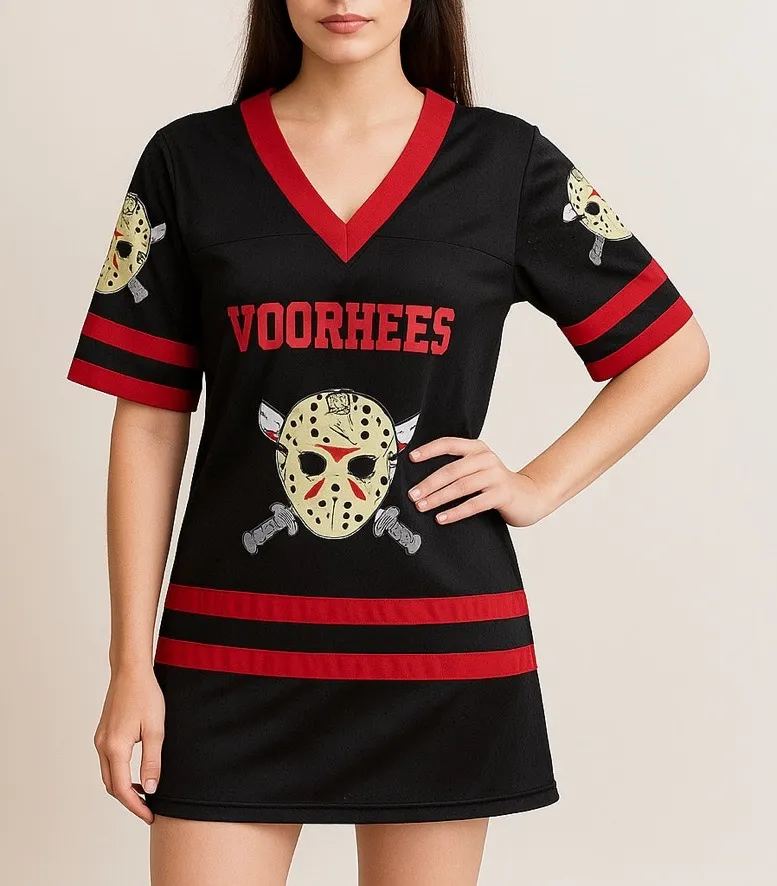 Condition: Gently pre-owned Rubie’s Friday the 13th Miss Voorhees jersey dress in very good condition with light general wear and minor cracking to the red vinyl graphics. Graphic on one arm peeling off at edges as shown in photos. No holes, stains, or tears noted. Measurements are approximate: chest 18.25”, length 35.75”, sleeve 12.75”. Channel your inner slasher icon with this Miss Voorhees black and red mesh dress, featuring bold Jason mask and crossed knife graphics, “Voorhees 13” lettering, and hockey jersey-inspired design. Made from breathable polyester mesh, this piece blends horrorcore streetwear, Halloween cosplay, and alternative fashion vibes—perfect for a spooky aesthetic, gothic party look, or casual horror fan outfit. Details: Brand: Rubie’s Officially Licensed Friday the 13th Merchandise Size: Large Material: 100% Polyester Style No. 888822 “Miss Voorhees” (Prod. Date Mar 2021) Pullover jersey dress with V-neck and red contrast trim