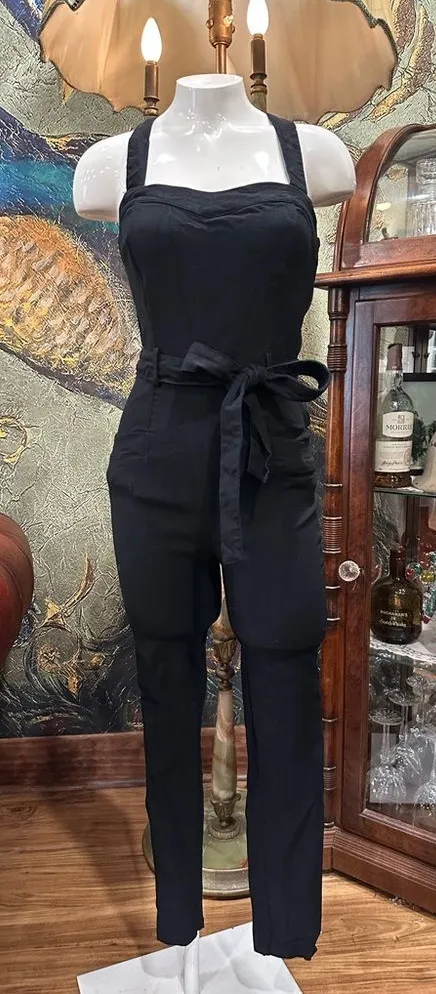 This sleek black jumpsuit features a halter-style neckline and a waist tie for a flattering silhouet... Show more
