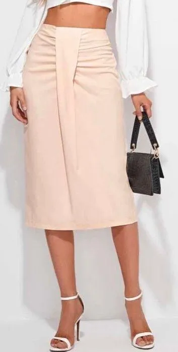 Ruched front Folded detail Back slit hem Pencil skirt Relaxed fit High waisted skirt/ high rise Has some stretch to it Midi skirt / mid calf length Ivory / nude / light beige neutral tone Hidden zipper back closure Available in size Xs & S