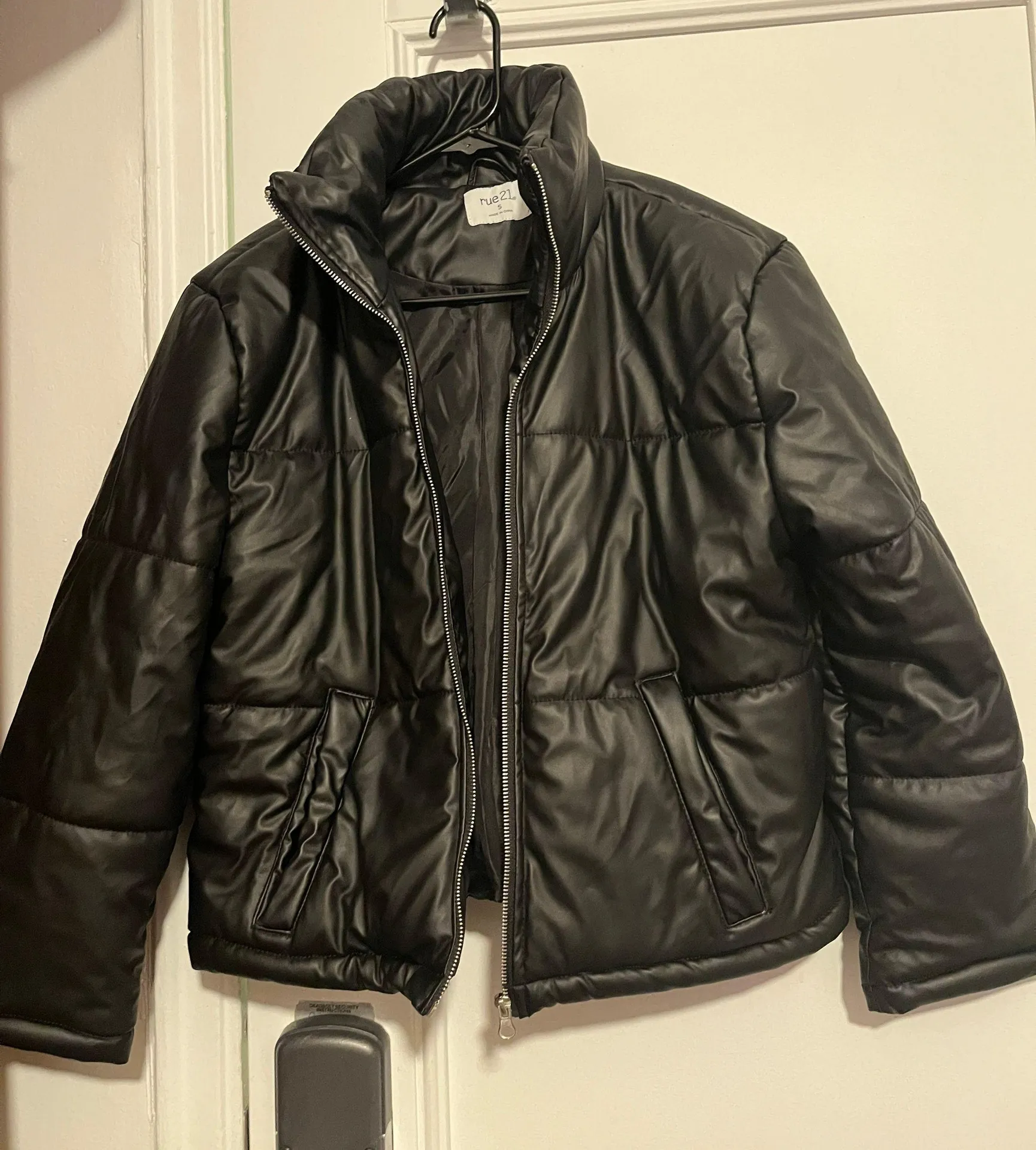 Rue 21 Leather faux black puffer jacket Size Small, can stretch, worn only twice. Very cute and w... Show more