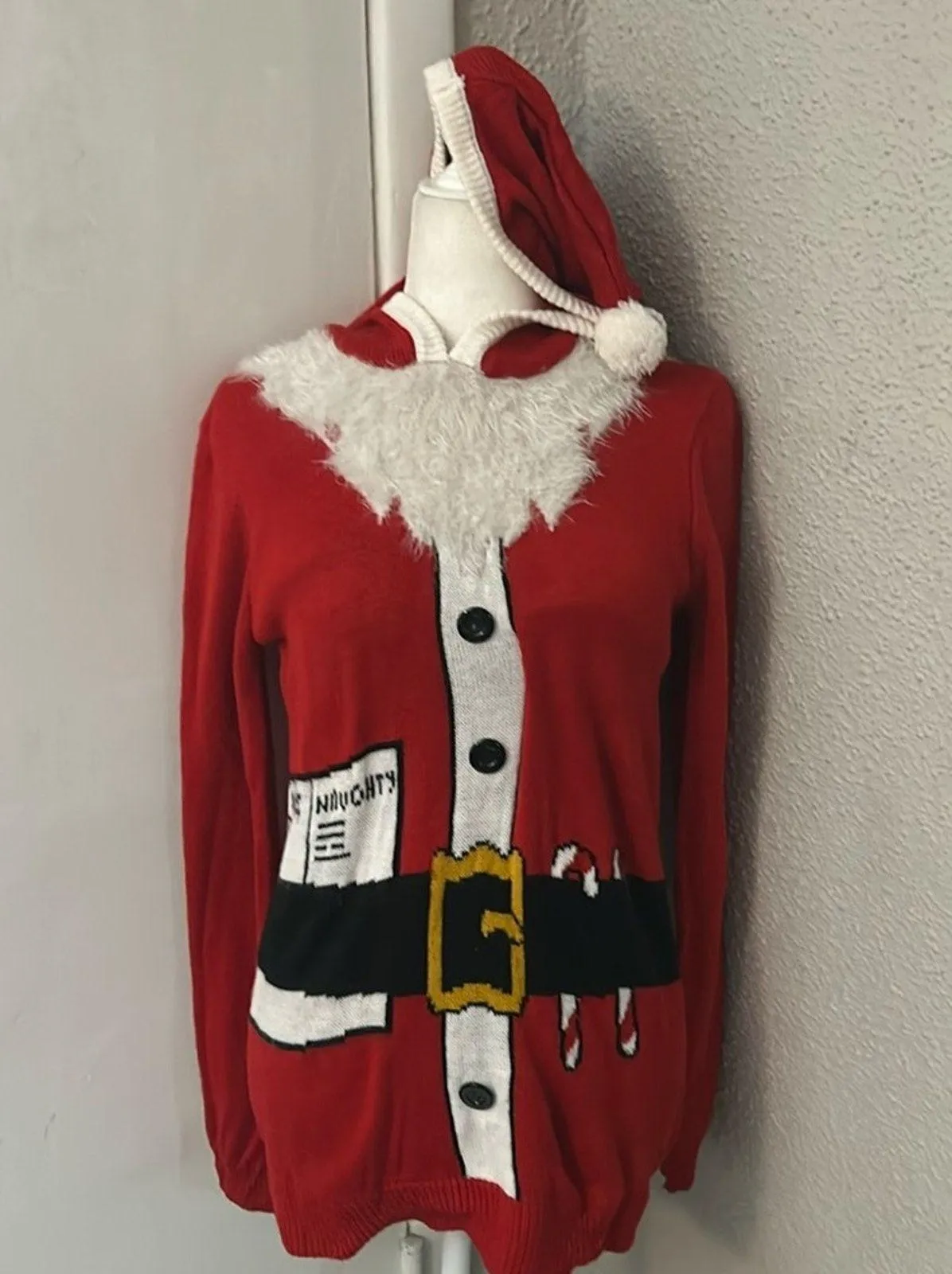 Style: Long sleeve hooded santa sweater with naughty/nice list design on front Color: Red/White Size... Show more