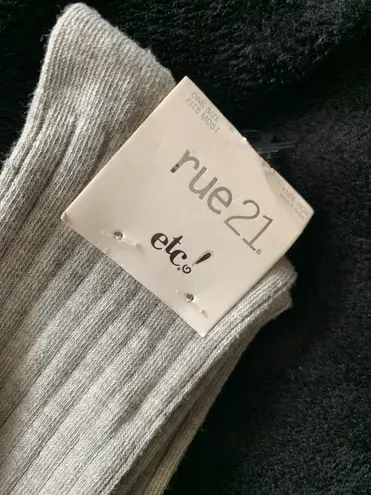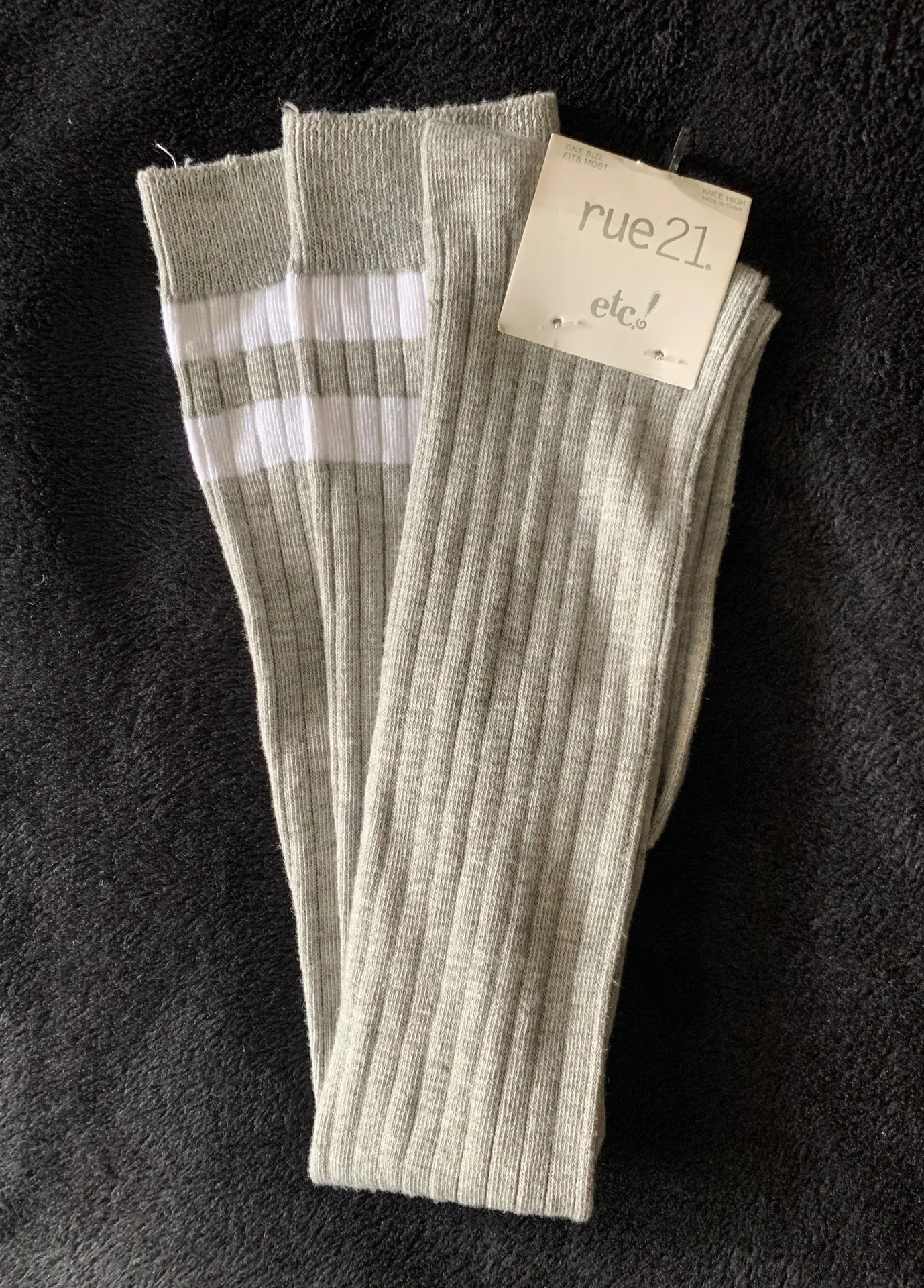 Knee high gray socks with white stripes, never worn. NWT.