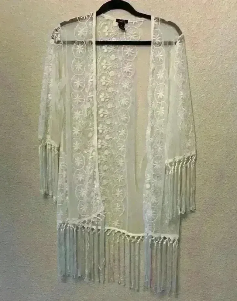 White Lace embroidered fringe cardigan sz XS Approximate measurements Pit to pit: 20” Length: 36”... Show more
