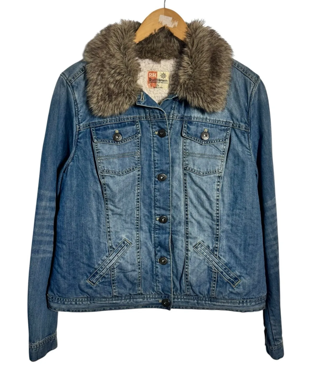 Ruff Hewn 90s Y2K Faux Fur Collar Denim Jacket Women L Blue Western Sherpa Lined Size L - $45 - From Hannah