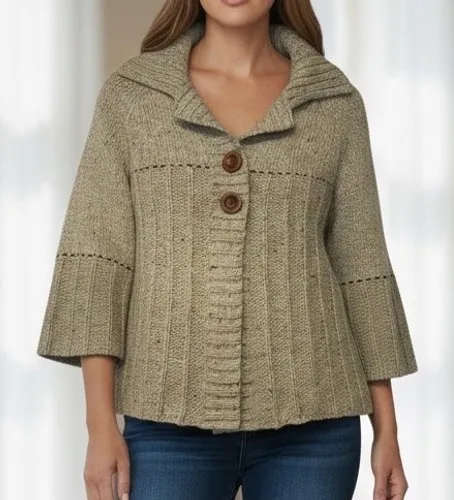 Wrap yourself in cozy comfort with this Ruff Hewn knit cardigan. Its textured weave and speckled brown buttons create a charming, rustic appeal, while the flared sleeves add a touch of vintage flair. The wide collar provides an elegant silhouette, perfect for layering over your favorite tops. Ideal for a casual day out, a cozy evening indoors, or a relaxed weekend getaway. Measurements: • Bust (pit to pit): 19 in • Length (shoulder to hem): 18 in Style: Cardigan Department: Women Material: Acrylic, Wool Blend Neckline: Collared Sleeve Length: 3/4 Sleeve Type: Sweater Features: Button Pattern: Solid Sleeve Type: Bell Sleeve Fabric Type: Knit Accents: Button Knit Style: Cable-Knit Season: Fall, Spring Fit: Regular Occasion: Casual, Travel Keywords: Ruff Hewn, knit cardigan, speckled buttons, flared sleeves, textured knit, cozy, rustic, vintage inspired, layering piece, fall fashion, winter wear, casual chic
