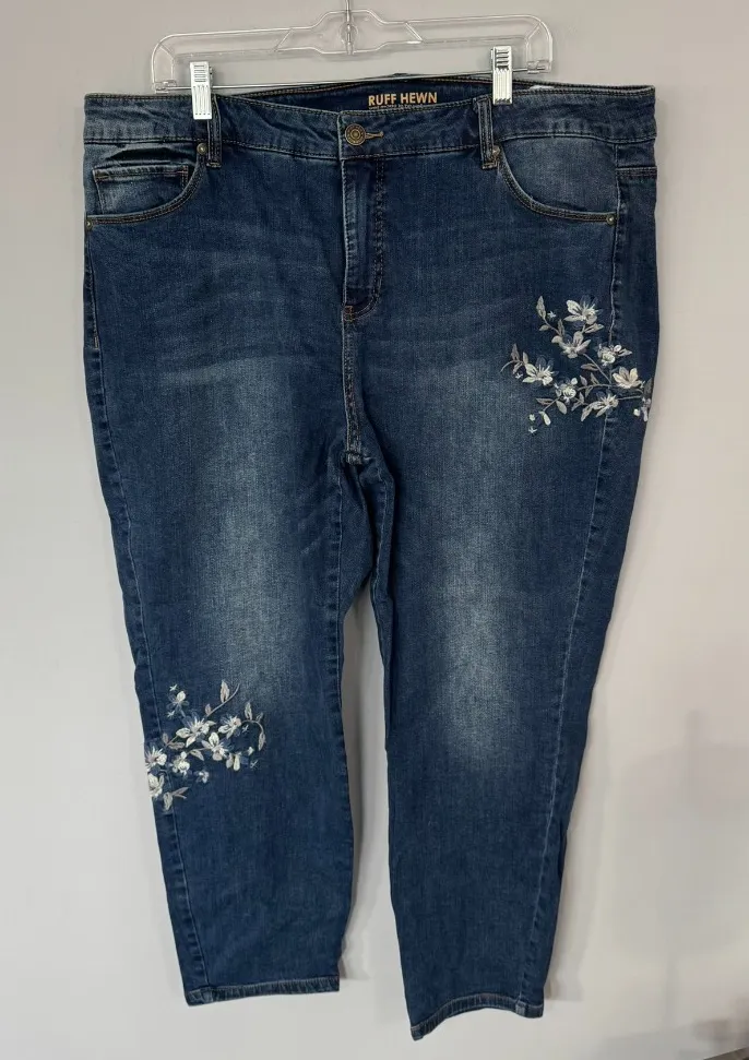 Ruff Hewn Skinny Ankle Jeans in Women’s Plus Size 22 W w/ Floral Embroidery. Jeans are in very good used condition with no flaws or stains and minimal wash wear. I only wore them once. Please see close-up pictures for condition details. Cotton & spandex blend. Offers welcome. Fast shipping.