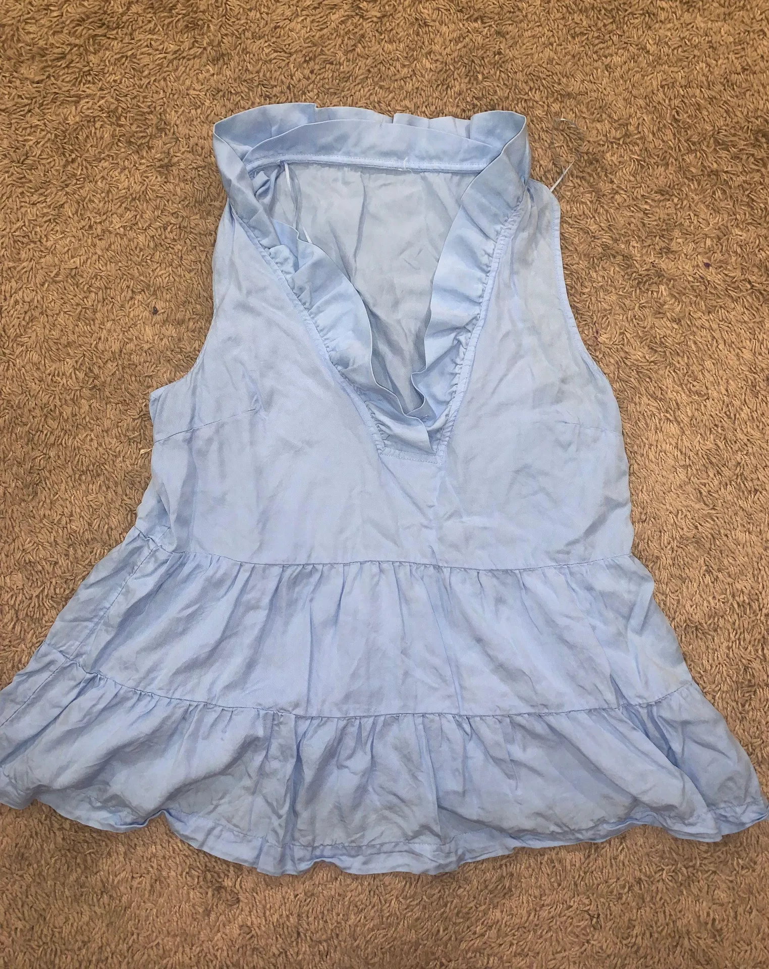 Okay so this blouse is soooo cute but I cannot find a single tag that says a name brand or size!!! But I believe this has been very lightly used! If I had to guess a size it would be medium/large!