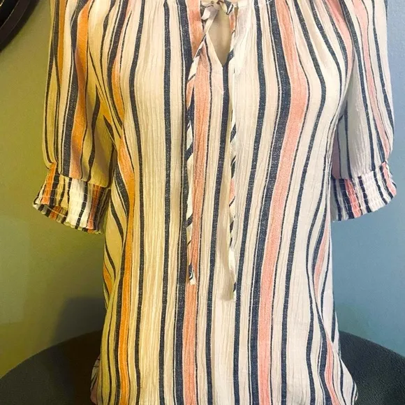 This striped blouse showcases a delightful combination of navy and pink hues, enhanced by a charming tie front and delicate ruffles. The short sleeves and lightweight fabric make it an ideal choice for warm weather, adding a touch of sophistication to any ensemble.