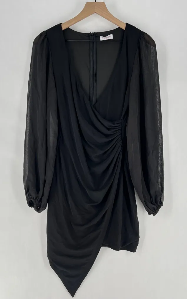 Rumor Womens Size M Black Mesh Sheer Balloon Long Sleeve Faux Wrap Mini Dress Size 12 (M) surplice v-neck faux wrap longer layered asymmetrical hem sheer chiffon long balloon sleeves stretchy back zipper closure mini length sexy, going out dress, cocktail, evening, statement 1807