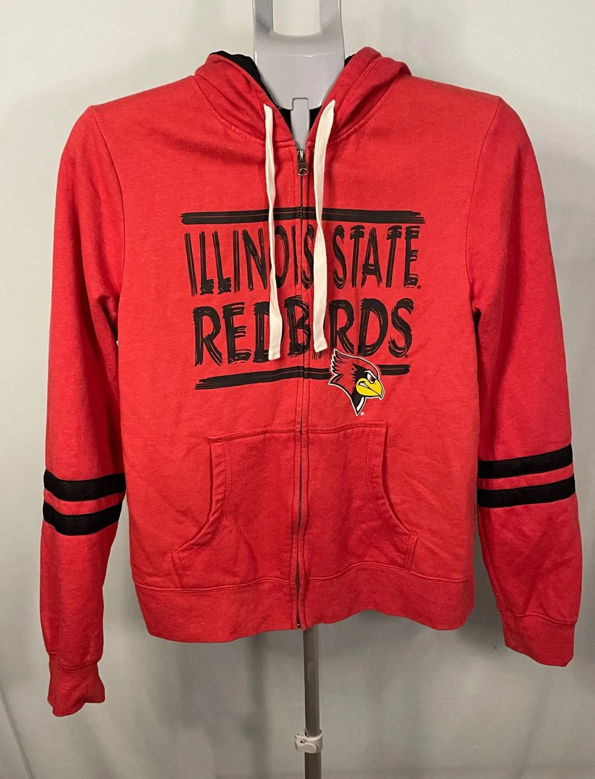 A sporty full-zip hoodie ideal for any Redbirds fan. This bright red hoodie features the Illinois State Redbirds logo prominently displayed on the front, complete with the team mascot. Design details include a comfortable hood with black lining, front pockets, and black striped accents on both sleeves. Perfect for game days, casual outings, or showing off your school pride around campus. Style: Full Zip Department: Women Type: Hoodie Closure: Zip Theme: College, School Features: Hooded, Pockets, Full Zip Fabric Type: Blended Fabric Material: Cotton, Polyester Pattern: Solid Sleeve Length: Long Sleeve Accents: Logo, Zipper Performance/Activity: School, Walking Keywords: Illinois State Redbirds, NCAA Hoodie, Full Zip Hoodie, Red Hoodie, Striped Sleeve Hoodie, College Apparel, Russell Hoodie, Redbirds Apparel, Sportswear, Athletic Hoodie, School Spirit, Game Day, Fan Gear