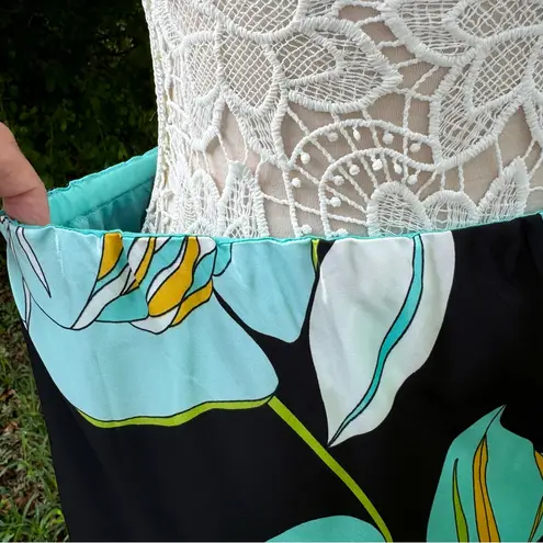Russell Scott 100% Silk Teal and Black Floral Iris Flower Skirt, preowned in EUC. No stains, holes or tears. Excellent condition. This skirt is STUNNING! Super vibrant color, 100% silk and fully lined. Lining is 100% polyester. Elastic waist and flounce/ruffle detail at the hemline. Size 8 Waist flat across unstretched 14” stretches comfortably to 18” Hips flat across approximately 21.5-22” Length 28”