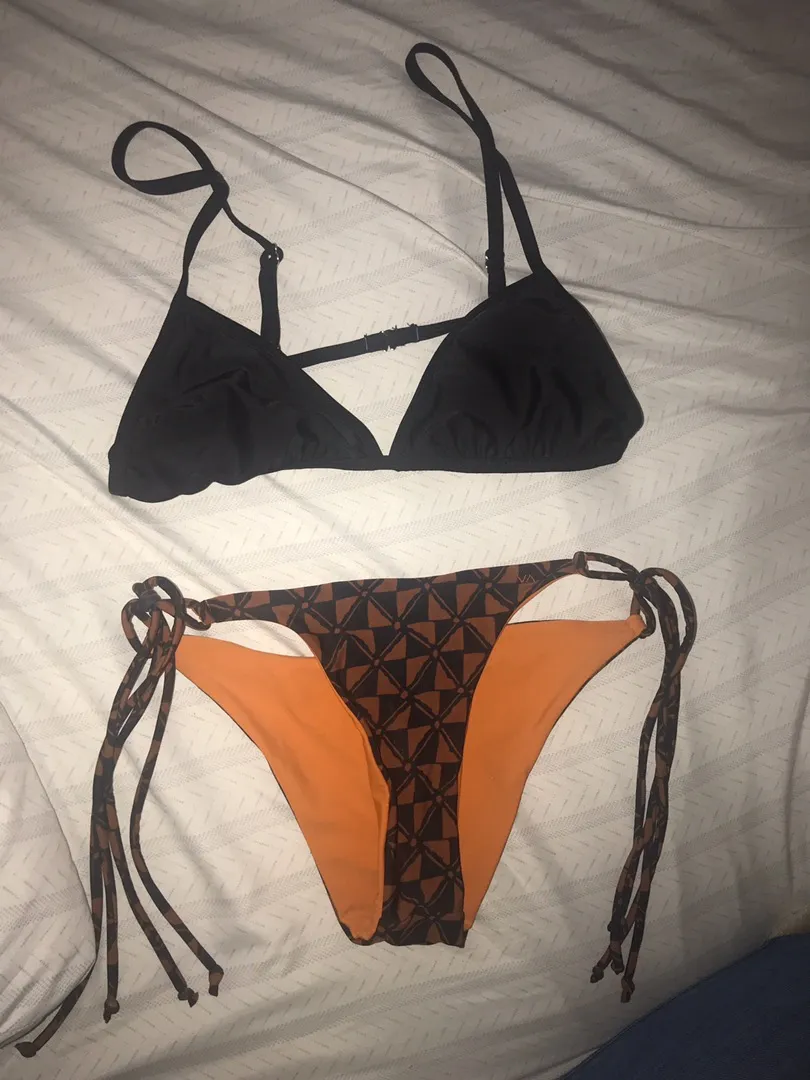 Black top I wear with it 🖤 RVCA Reversable bottoms 🧡🖤🧡 two spots inside but tiny from being wash... Show more