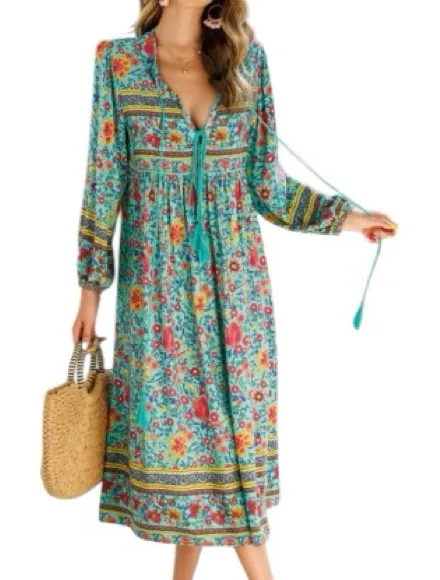 R.Vivimos Floral Long Sleeve Retro Print V Neck Tassel Bohemian Midi Size Medium Excellent preowned condition **THE OVERALL COLOR IS BLUE GREEN WITH PINK AND YELLOW FLORALS** DUE TO LIGHTING PICTURE IS NOT REFLECTING TRUE COLOR. Color: Blue Green with pink and yellow florals Material: Cotton/Rayon Neckline: V Neck Sleeve Length: Long Sleeve Dresses Length: Midi Dress Unlined Tassel detail Occasion: Beach, Party, Casual Daily FLAT LAY MEASUREMENT PIT TO PIT 19.5 LENGTH 45.5 SHOULDER TO SHOULDER 16.5 SLEEVE 22.5