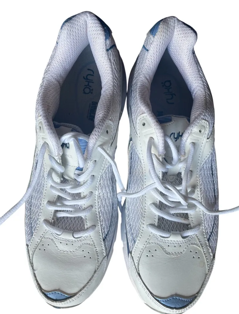 Ryka Rocker Advance Ortholite Low Top Sneakers Walking Shoes Women's Size 10- look brand new! -Comfort Foam insole -Leather and fabric upper - Color: White/Blue Trim -heel height 1.3” -condition: never worn; like brand new
