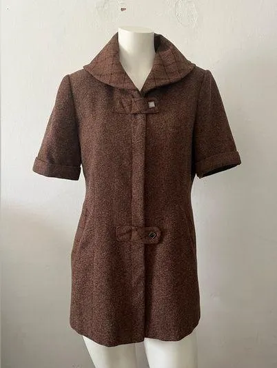 Vintage 70s style short sleeve pea coat No manufacturer or material label Feels like wool exterior and nylon lining Two matching brown tables with silver triangle shape snap buttons for enclosure Hidden brown plastic buttons also fasten down the middle Sharp collars with black check pattern Cuffed short sleeves Black check pattern at the side pocket Measurements: 30.5 inches length 28 inches bust
