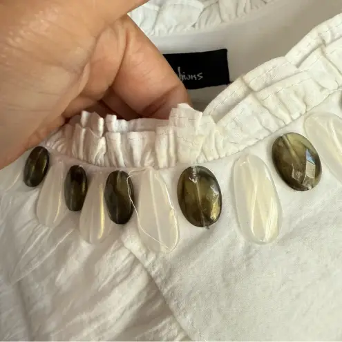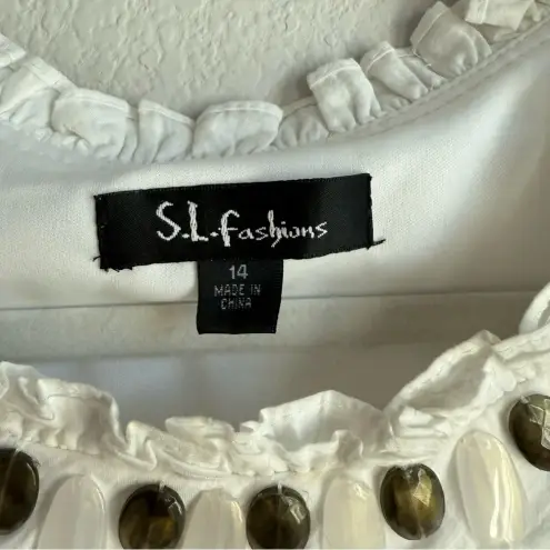 Add a touch of elegance to your wardrobe with this stunning white dress from S.L. Fashions. The dress features a jeweled neckline, ruffled accents, and a tiered design that flatters your figure. The round neckline and sleeveless design make it perfect for warm summer days or a special occasion like a wedding or party. Crafted from a blend of materials including rayon, polyester, nylon, and cotton, this dress is both comfortable and stylish. It has a zip closure for easy wear and requires dry cleaning and spot cleaning for proper care. This knee-length shift dress is a size 14 and is perfect for the spring and summer seasons. Length 37” Bust 19” New with tags Dress does have a makeup spot by neckline, picture is on listing.