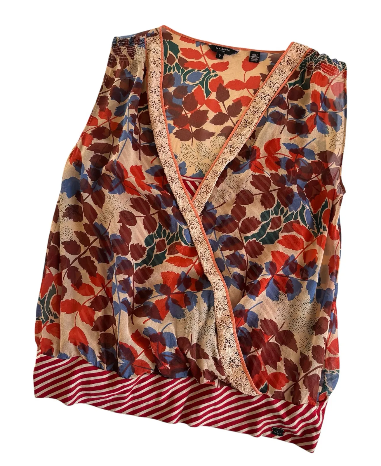 Features: Ted Baker Layered 100% Silk Sleeveless Floral and Striped Blouse; two in one top with a bu... Show more