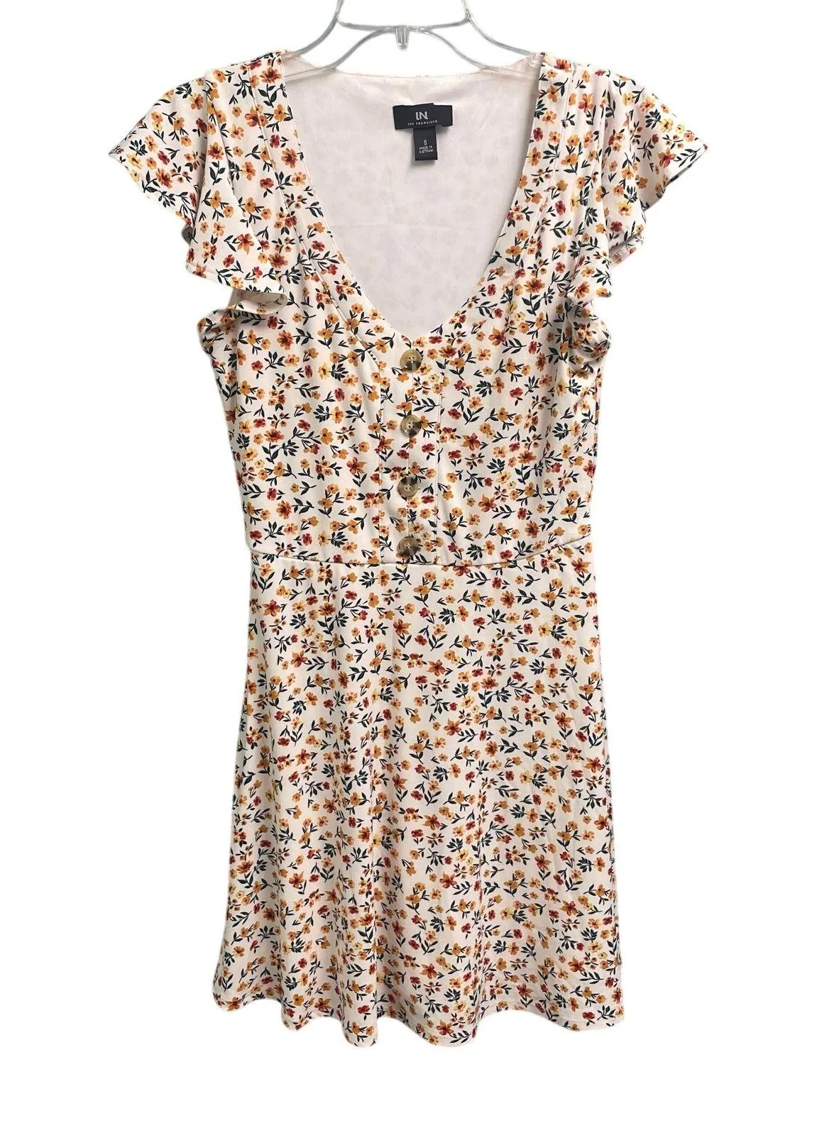Flirty and feminine mini dress from I.N. San Francisco size Small Measures 15" across the chest, 34" from shoulder to hem All over floral print with a deep v-neckline, flared skirt and button details at the chest. Lightweight and comfy Great for brunch, warm weather and casual summer nights Effortless, boho, feminine