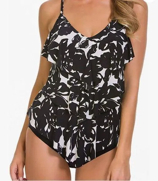 Magicsuit Magnolia Blossom Rita Tankini Top Size 8 -Black White Magnolia Blossom Print -V neckline -Non removable built in soft cup -Adjustable shoulder straps -Full straight back -Cascading tiered ruffles at front -Polyester/Spandex/Nylon -Size 8 Excellent Preowned Condition