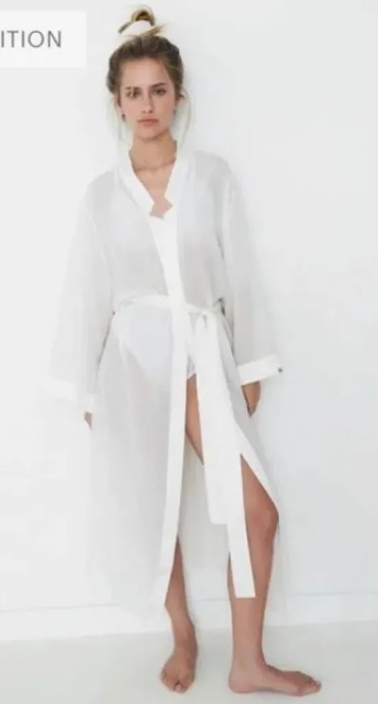 Lunya Washable Silk Chiffon Kimono Robe Tranquil White (off white/Ivory) - Women's size Large /Extra Large In great condition, no flaws 100% Silk Satin Silk Trim Chiffon Silk Body Sheer Waist Tie Length 48.5"