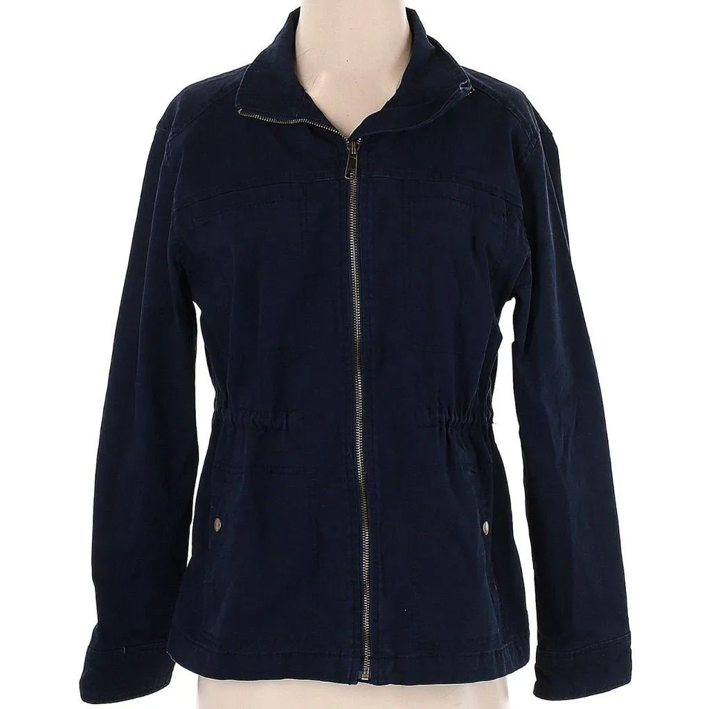 Stylish navy blue utility jacket. Features a zip front and side pockets. Perfect for casual wear.