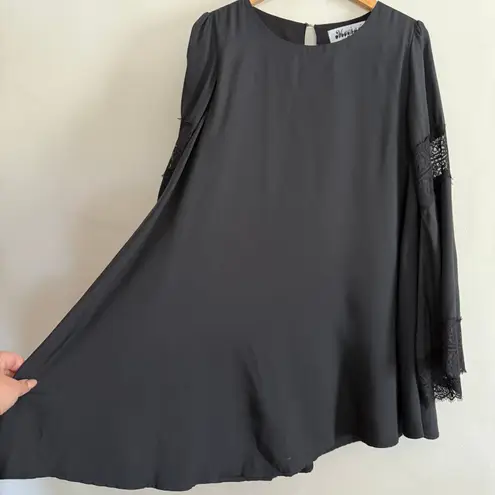 MEGHAN FABULOUS | Black Bell Sleeve Lace Trim Mini Trapeze Dress Flowy Lightweight Trapeze Dress Lace Trim Sleeves with Lace inset Bell Sleeves Long Sleeve Mini Length Round Neck Excellent condition - no flaws Womens Size Large Lay-flat measurements: Chest, pit-to-pit: 20 inches Length, Center Back: 33.5 inches Boho, Bohemian, Party Dress, Artsy, Little black dress, Hippie, Flare Sleeve Dress, Bell Sleeve Dress