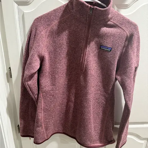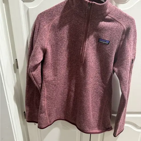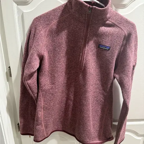Cozy pink quarter-zip fleece pullover by Patagonia. Perfect for layering and outdoor activities.