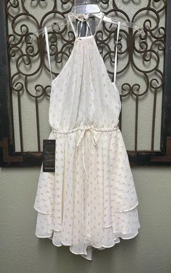 Bebe sleeveless neck tie Mini dress with double layer Ruffles and elastic tie waist Size Small