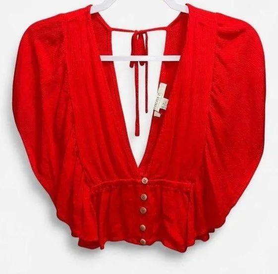 Elevate your wardrobe with this eye-catching red Forever 21 crop top. This top features a plunging V... Show more
