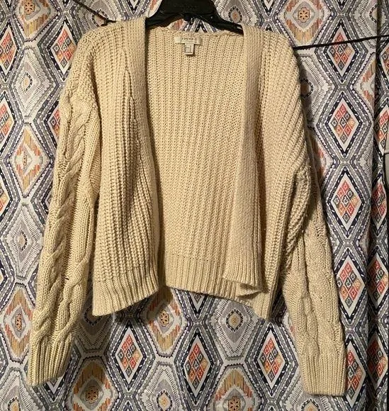 knit cardigan open style no buttons cable knit detail down sleeves super comfy and warm& cozy cream... Show more