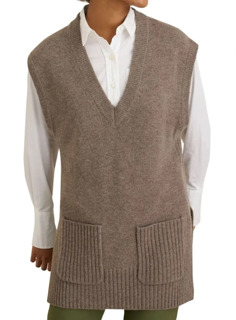 Alex Mill Kiah Merino Wool Blend V- Neck Sweater Size Large Make a contemporary statement in this V-neck sweater-vest made from a merino wool blend and completed with front patch pockets. 90% merino wool, 10% cashmere Hand wash, dry flat Imported Preowned and in excellent condition