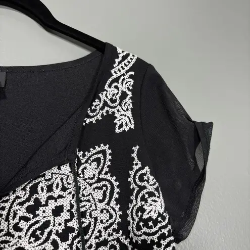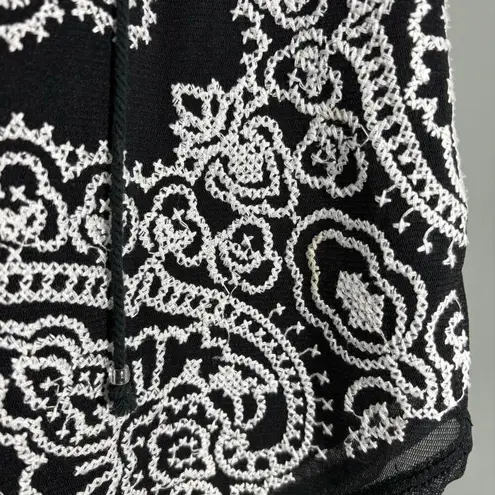 Women's boho chic top by INC International Concepts. This black top has a white embroidered front in a bandana pattern, a sheer overlay, and a split v-neck with beaded strings. It is 100% nylon with 100% polyester embroidery. The top is a size small. When laying flat it measures approximately: Armpit to armpit: 19 inches Length: 24 inches The top is in amazing shape.