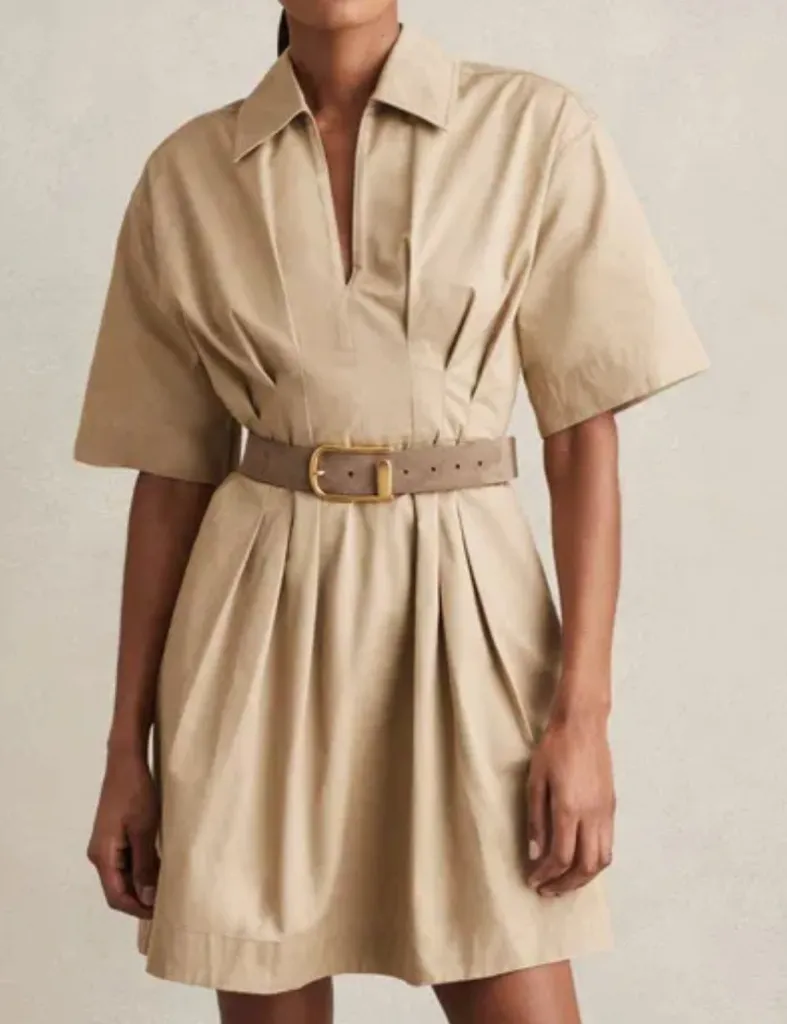 Size 10 (missing size tag but it’s size 10) No flaws Reiss "Rosalie" mini shirtdress finished with waist pleating V neckline with spread collar Elbow sleeves Smocked lower back Hem falls above the knee A-line silhouette Slipover style Cotton Belt does not come with dress