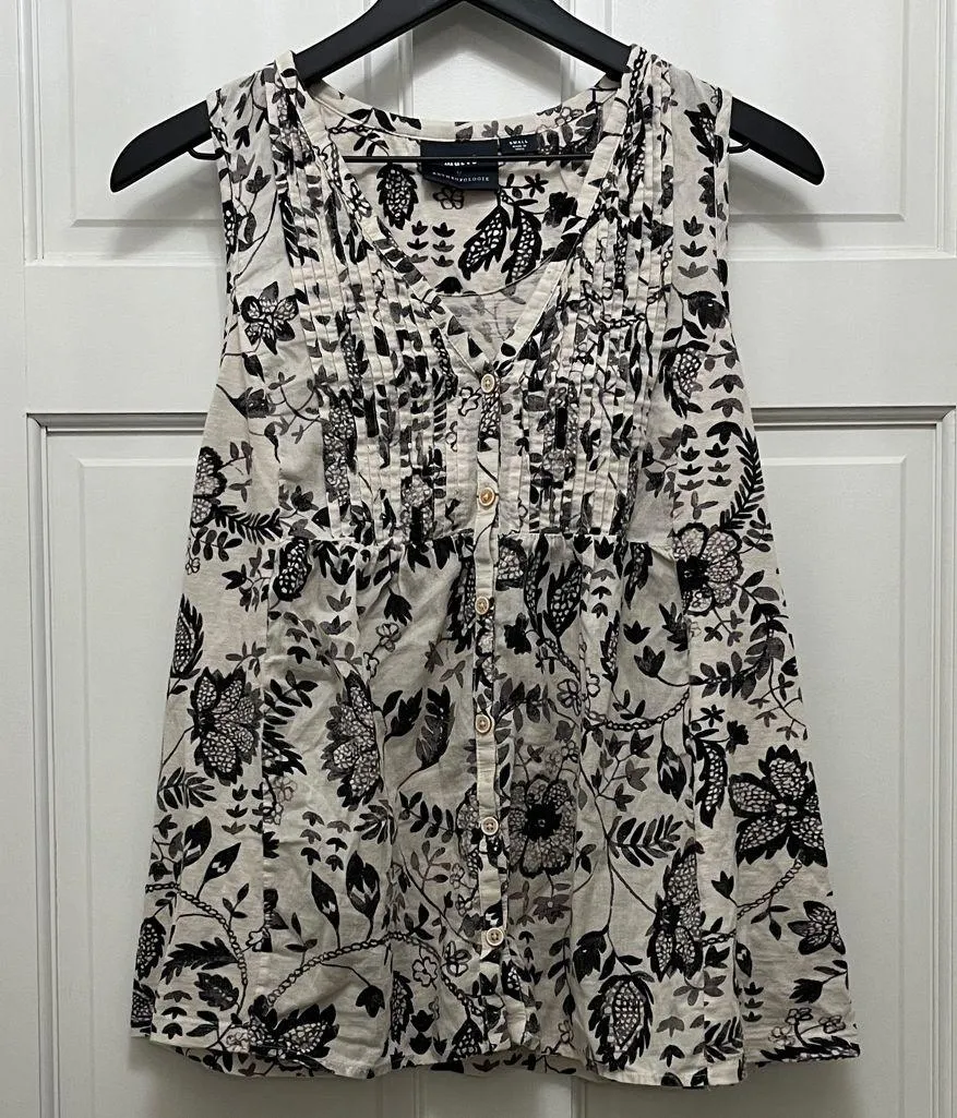 Features button-down front Made in India Creme gray black artistic floral print Pintucking detailing Tags: summer lightweight breezy airy beach beachy boho bohemian casual feminine delicate details breathable flower leaf prairiecore pleated pleats