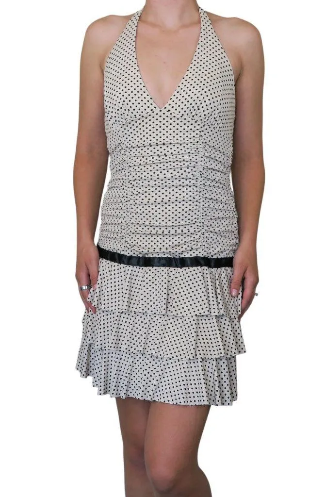 XOXO Collection. Off white dress with small black polka dot print all over. Black ribbon belt detail... Show more