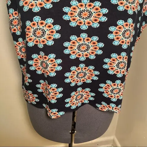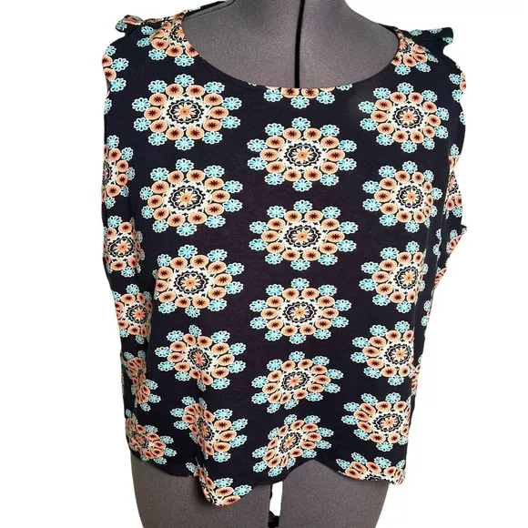 Great condition, minor wear. Crown & Ivy. sleeveless blouse. Navy blue with teal, coral and white ge... Show more