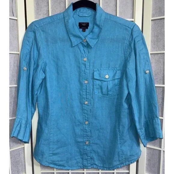Talbots Petites 100% Pure Irish Linen Blue 3/4 Sleeve Button Up Pocket Blouse in USA Women's Size Sm... Show more