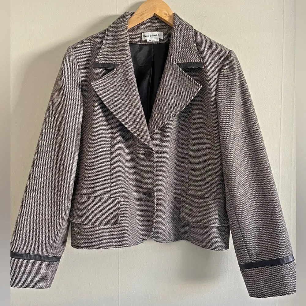 Structured and timeless, this vintage Harvé Benard Sport blazer from the late 90s/early 2000s features a textured brown and cream woven herringbone pattern with faux leather trim on the collar and cuffs. Fully lined with a cropped, tailored silhouette and light shoulder padding. • Vintage Harvé Benard Sport (Made in Ukraine) • Estimated size: Large (22” chest flat) • Woven brown & cream herringbone • Faux leather trim details • 2-button front, flap pockets • Light shoulder pads, full lining • Tiny flaw: small hole on back of sleeve (see close-up) Style keywords: vintage blazer, dark academia, preppy layers, quiet luxury, 90s officewear, fall fashion, woven textures, neutral tones
