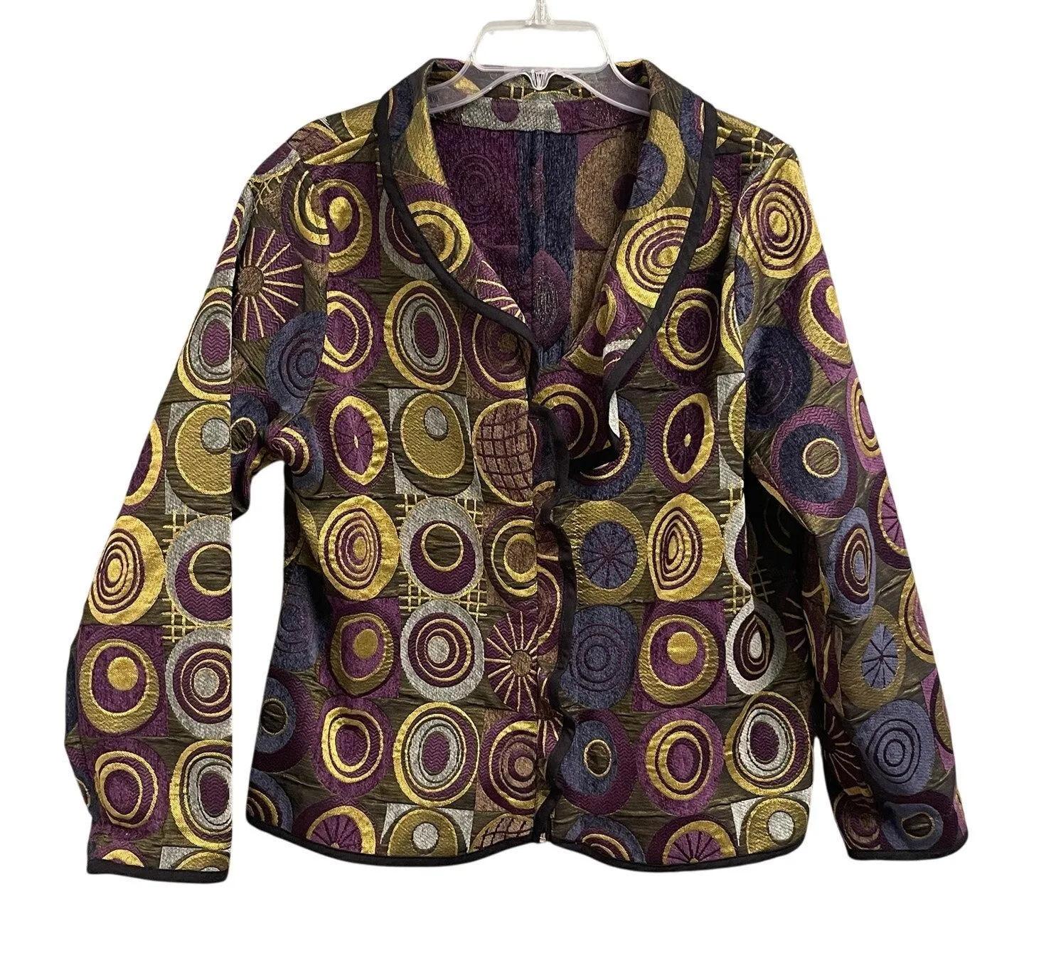 Excellent condition womens reversible jacket from Winding River, size Large Geometric print pattern woven in a tapestry style fabric Art To Wear Eclectic Colorful Maximalist Bold
