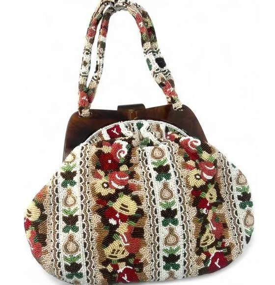 This is a wonderful handbag from the 1930s. It is very summery. It has a bakelite plastic frame with... Show more