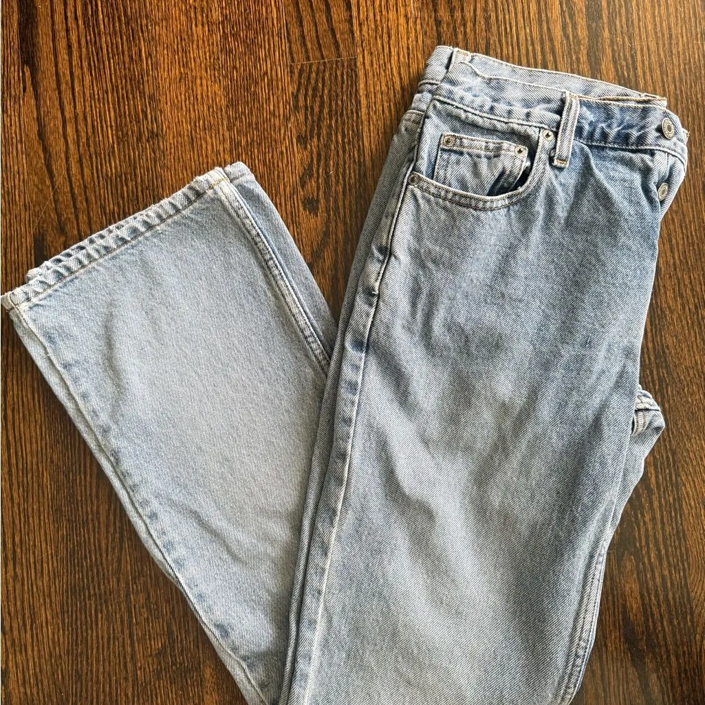 Experience timeless style with these blue straight leg jeans from American Eagle Outfitters. Crafted... Show more