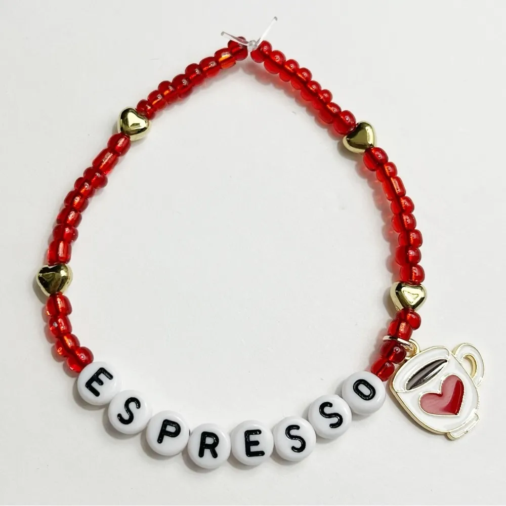 Add a playful touch to your outfit with the Espresso beaded bracelet. Featuring red beads, this accessory is perfect for any occasion. Espresso Sabrina Carpenter Stretchy Coffee cup charm *Not sure if they do friendship bracelet trading at Sabrina Carpenter’s concerts but I think they’re cute and fun regardless!