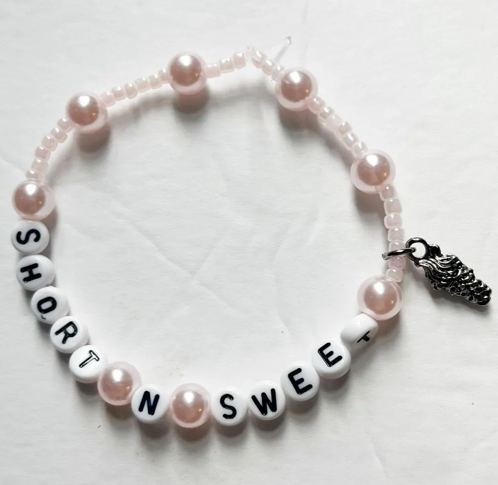 Add a playful touch to your outfit with the Short N Sweet beaded bracelet. Featuring pastel pink beads, this accessory is perfect for any occasion. Short N Sweet Sabrina Carpenter Stretchy Ice cream charm