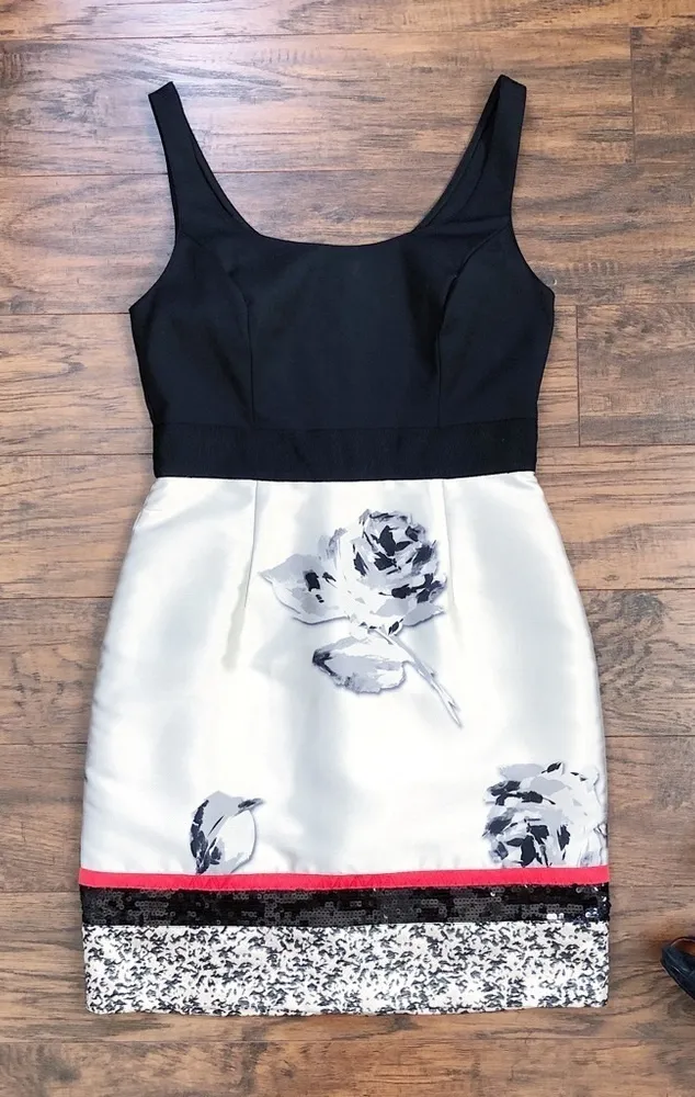 Gorgeous cocktail dress by Sachin + Babi from the Noir line. Fitted sleeveless sheath style ft solid black stretch cotton bodice with scoop neck, wide grosgrain waistband, and slim skirt in grey & black floral pattern brocade with bands of textured red, black sequins, and black & silver jacquard along the hem. Bust 33-36“, waist 28“, hips 38“, length 34“. Size 4, excellent preowned condition with a few missing sequins (not at all noticeable, see photos). All measurements taken with garment lying flat & doubled where applicable. Christmas, holiday party, festive, NYE, New Year’s Eve