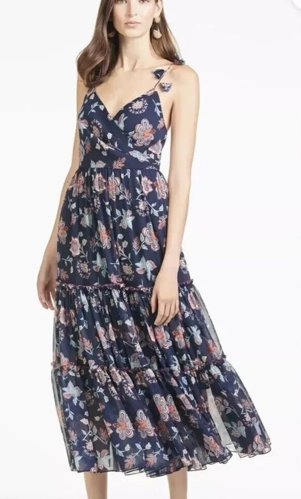 NWT sachin and Babi Dalia Eastern Gouache Botanical Floral Tiered Dress Sz 8 midi dress Measurements approximate 16" p2p Waist 15" Shoulder to hem 45" Our Dalia dress in a Eastern Gouache Botanical print finds its way into a spaghetti strap garden dress that can take you from day to evening with ease. The surplice bodice creates a feminine and flattering effect, and a seam at the high-waist hits above the hip and falls into an elegant a-line skirt. Sachin and Babi believe in celebrating every day, dressing with joy, and creating clothes that inspire beauty and confidence.