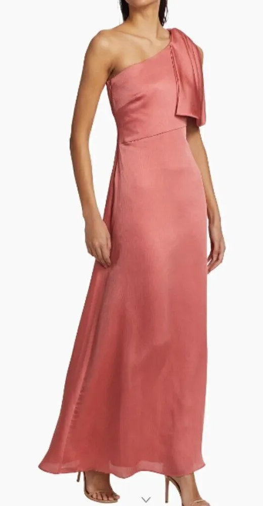 The Chelsea column gown from Sachin & Babi is crafted of crinkle satin georgette. An asymmetric one-shoulder bodice with a bow detail defines this fitted style. One-shoulder neckline Sleeveless Concealed side zip closure 100% polyester Dry clean Imported About 62" from shoulder to hem Women's Size 8 ****Priced to sell based on flaws. This dress has a few seam runs on it, as shown in photos MSRP $285