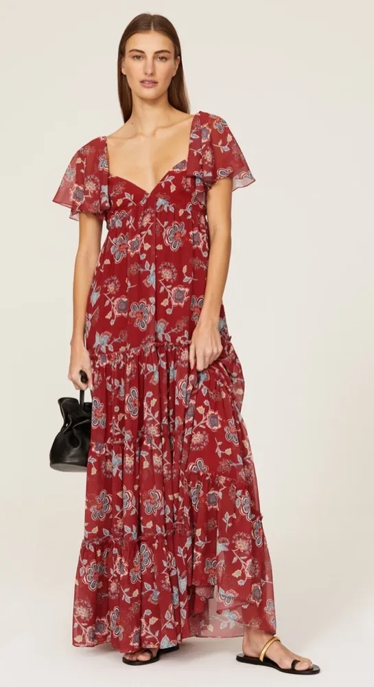 Excellent Condition like new Oversized Fit Flutter sleeves and floaty tiers add romance to this Sachin & Babi maxi dress that's bound to get lots of compliments. Style with the Mini Vase Leather Bag from Little Liffner and the Tropicalia Small Tote from Marni Accessories. Red chiffon (100% Polyester).Maxi. V-neck. Short sleeves. Side zipper closure. 58" from shoulder to hemline. Imported. Box B